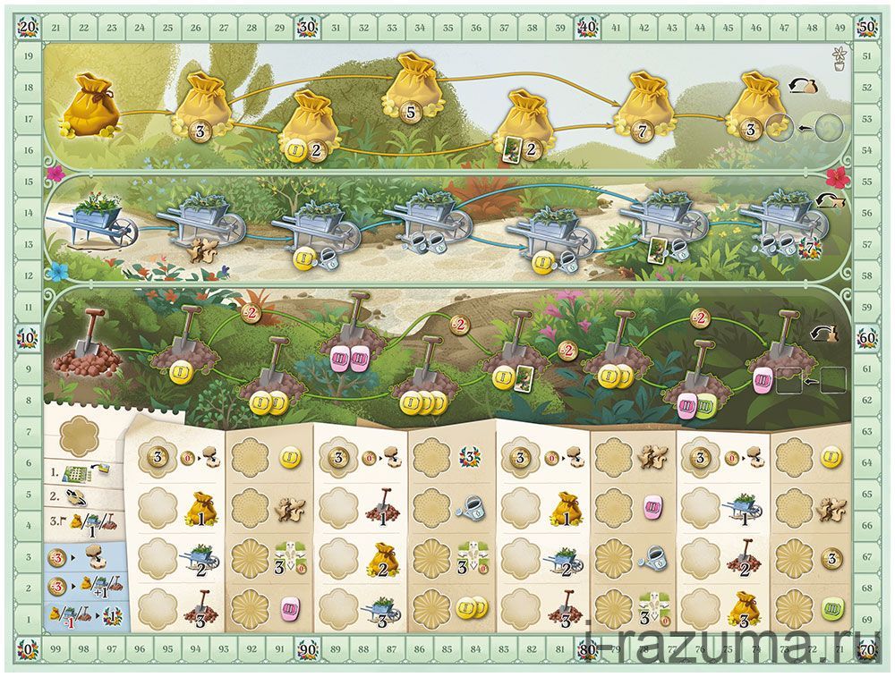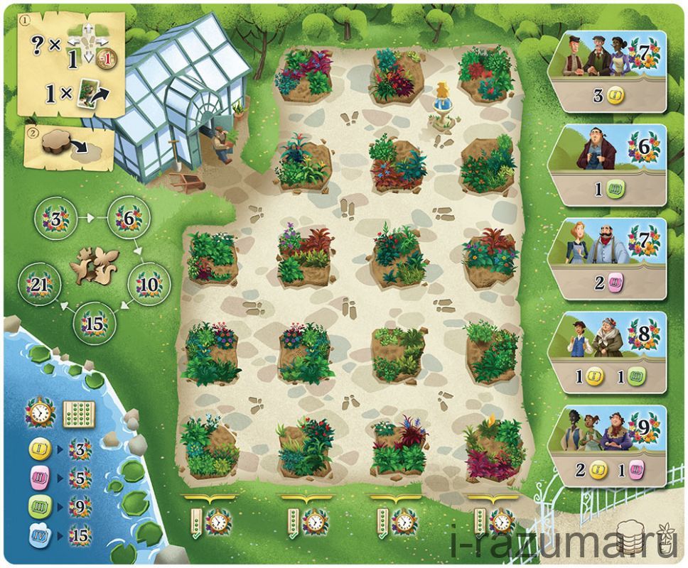Участники нанимают садовников, отправляются в экзотические путешествия и собирают редчайшие образцы цветов со всего мира. Главная задача — не просто накопить коллекцию, но и грамотно обустроить свой личный сад так, чтобы он привлекал как можно больше посетителей и превосходил владения соперников.