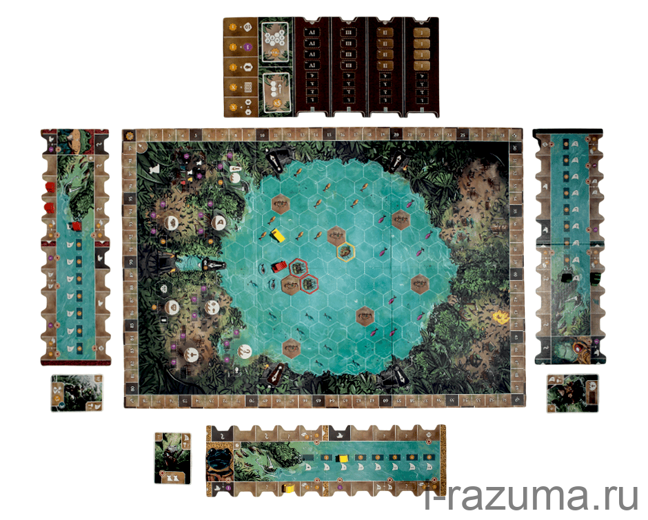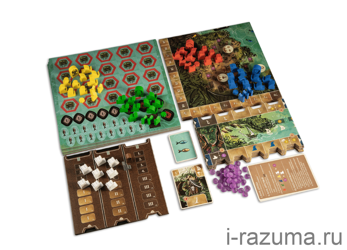 Чтобы вести своё племя к процветанию, придётся продумывать каждый ход. Сначала вы выбираете карту лидера на раунд — она определяет порядок хода, стоимость строительства, дальность плавания и особые способности. Затем строите поселения, ловите рыбу, разыскиваете древние храмы, торгуете и проводите празднества.